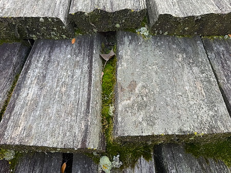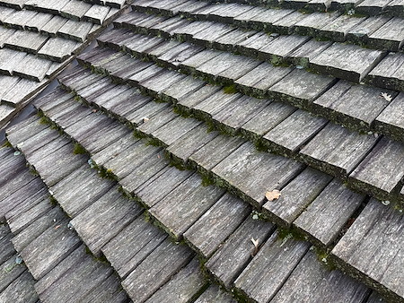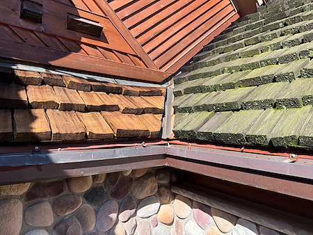 "Cedar roof" is what most homeowners say, even though the material is cedar shakes or shingles. Cedar naturally weathers gray. Over time, shaded slopes can host moss, lichen, and algae that hold moisture against the wood. Careful cleaning restores a healthy surface and helps your roof last. We also help you understand how color will change: after cleaning, the roof returns to a buff tan tone, and the gray patina will come back over the next season unless you maintain it.